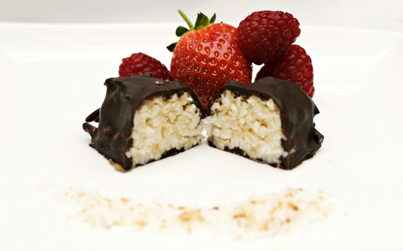 Once the chocolate is smooth, remove the coconut bars from the freezer and using a fork coat each one in the chocolate.