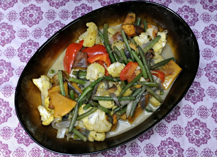 This delicious curry is good enough to eat all by itself. You could use chicken stock instead of vegetable stock if you want to incorporate some additional protein into the dish. You can make it in advance – just be sure to re-heat it gently otherwise the coconut milk will split. By all means interchange the vegetables for broccoli, mushrooms, green beans, chickpeas or butternut squash depending on what you fancy.